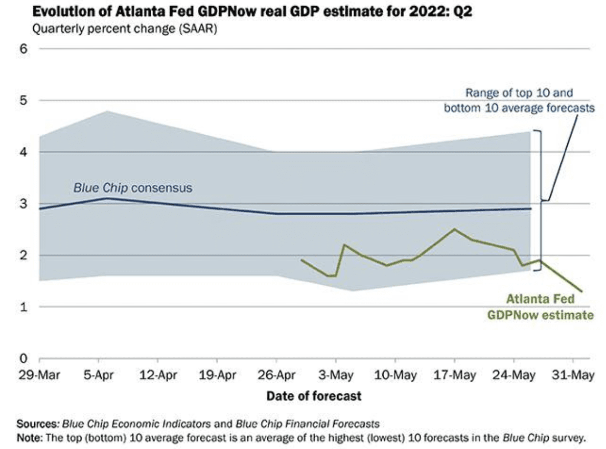 Consider the latest estimate from the Federal Reserve Board of Atlanta – which estimates Q2 2022 growth at just 1.3%.