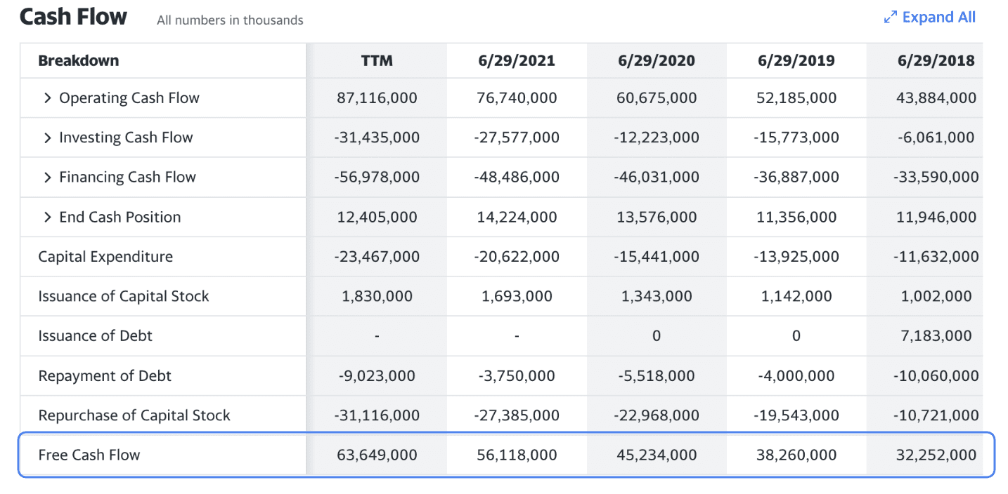MSFT"s annualized FCF for 2022 is $63.65 Billion (last row).