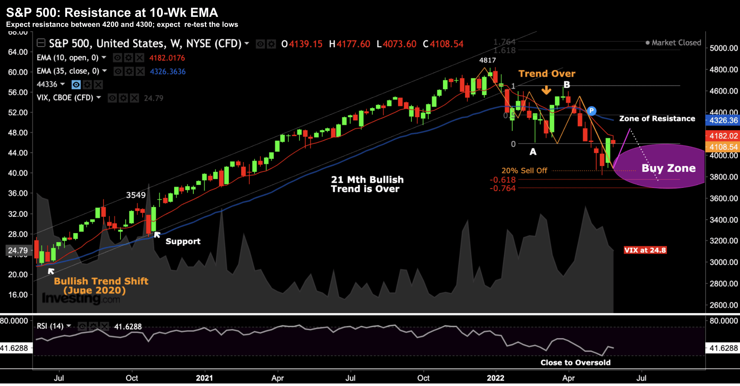 We found support in the 61.8% zone (i.e. around 3800) and then rallied to the 10-week EMA.