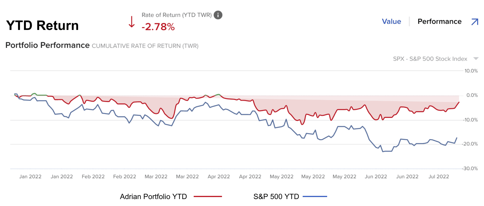 I am not yet convinced – despite being ~65% long (my YTD % return (red) vs the S&P 500 below)