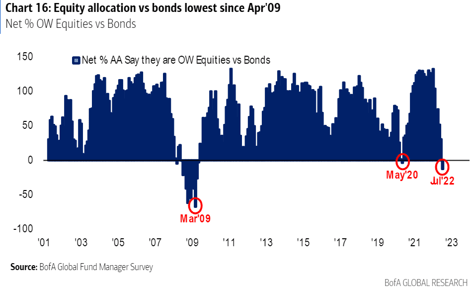 The latest edition of Bank of America Corp."s monthly survey of global fund managers finds that they are now more underweight in stocks than bonds than at any time since March 2009.