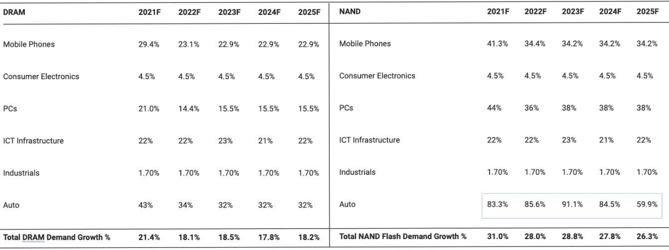 Looking ahead at the demand outlook across the various segments for DRAM and NAND – it appears strong (with research from Khaveen Investments)