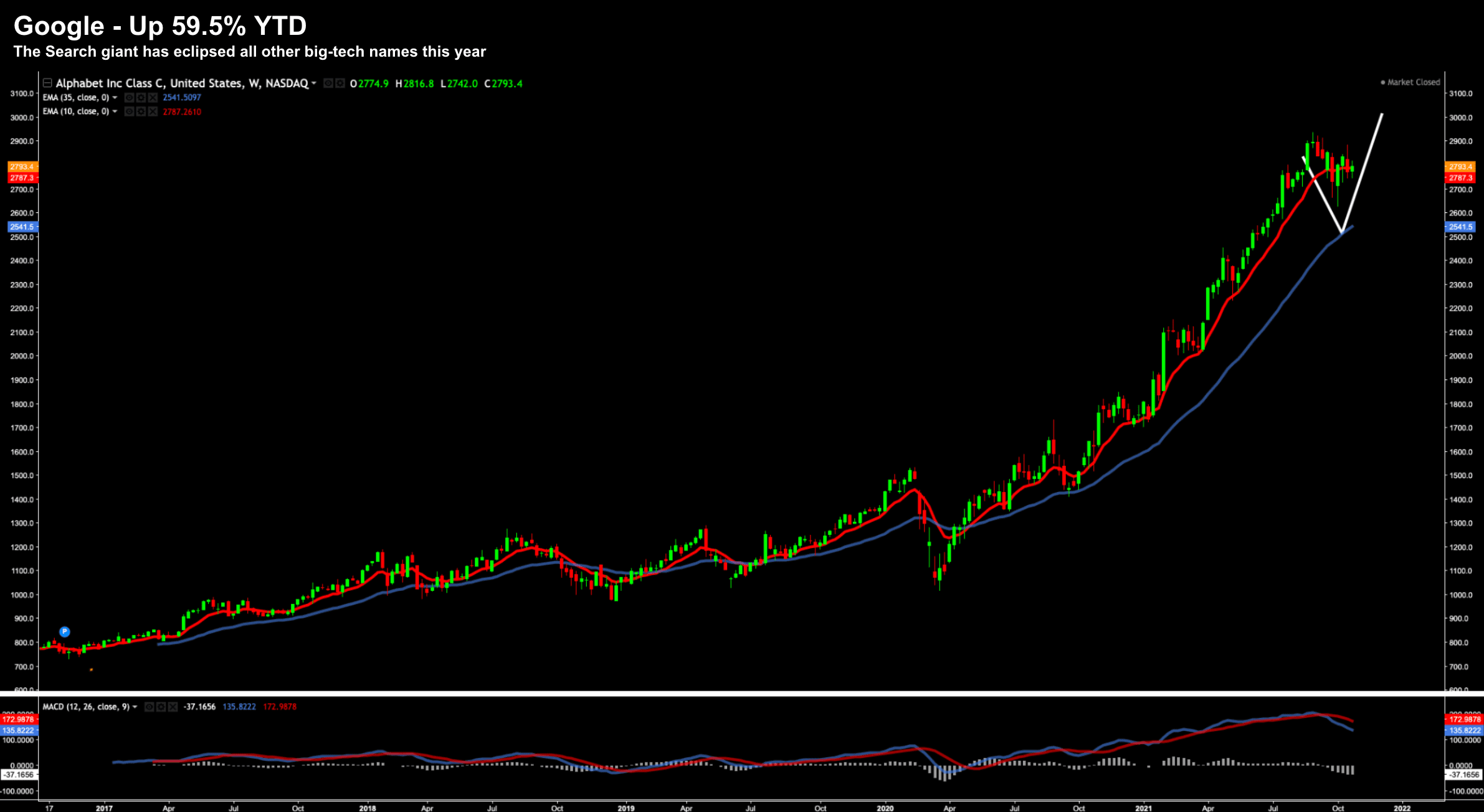 Whilst MSFT is up 40% YTD – it trails Google which is up an incredible 56% as it lagged other mega-tech peers last year.