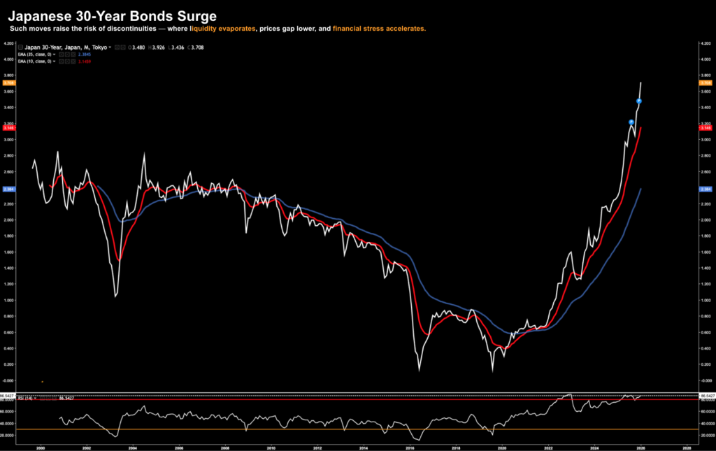 - Bond markets are reasserting discipline. After years of central bank suppression (through emergency programs like QE) – long-term yields are moving rapidly when credibility is questioned. Japan is no longer an island. Its bond market now trades in line with global norms, reducing its shock-absorber role.