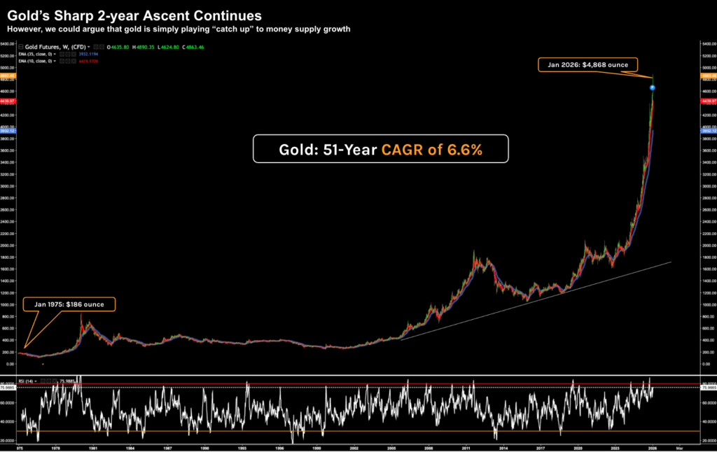 Put another way – for over 50 years these two enjoy a strong correlation. However, in the past two years – gold is playing catch up.