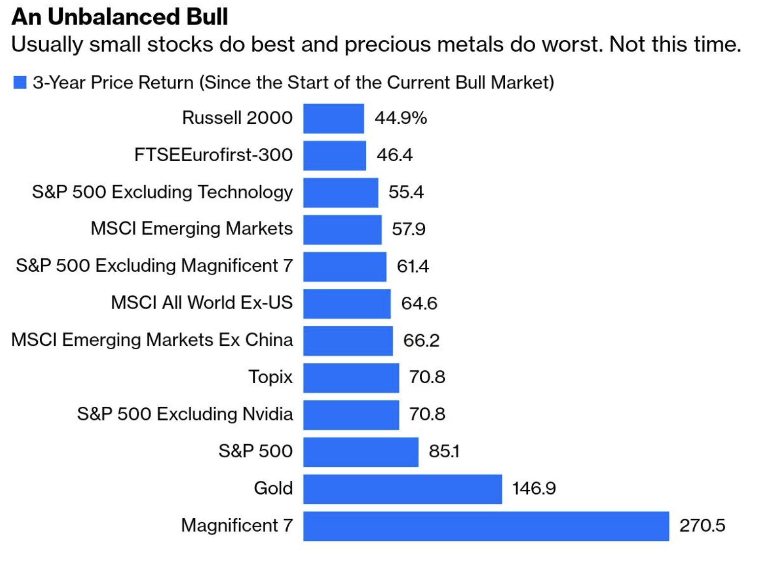 The market is a heavily concentrated bet on just seven names (all of which are extended in terms of their valuations)