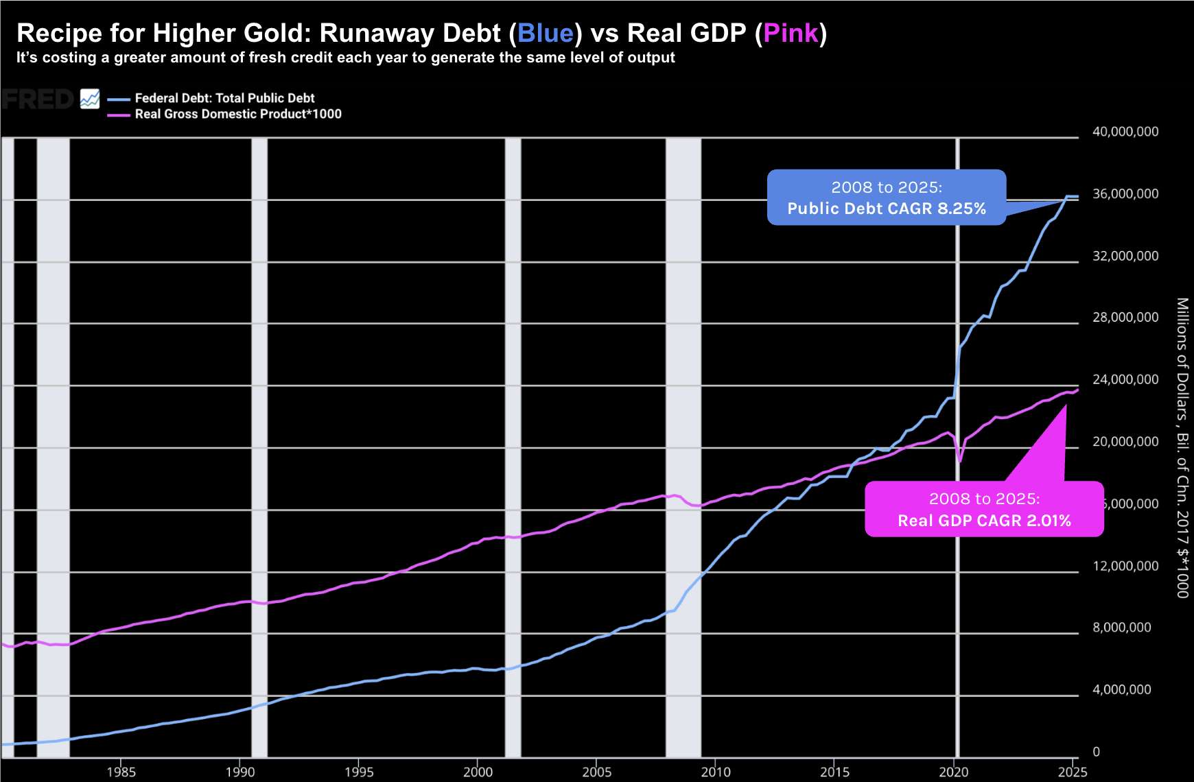 With public debt travelling at a CAGR of over 8% the past ~20 years – it"s little wonder gold has accelerated.