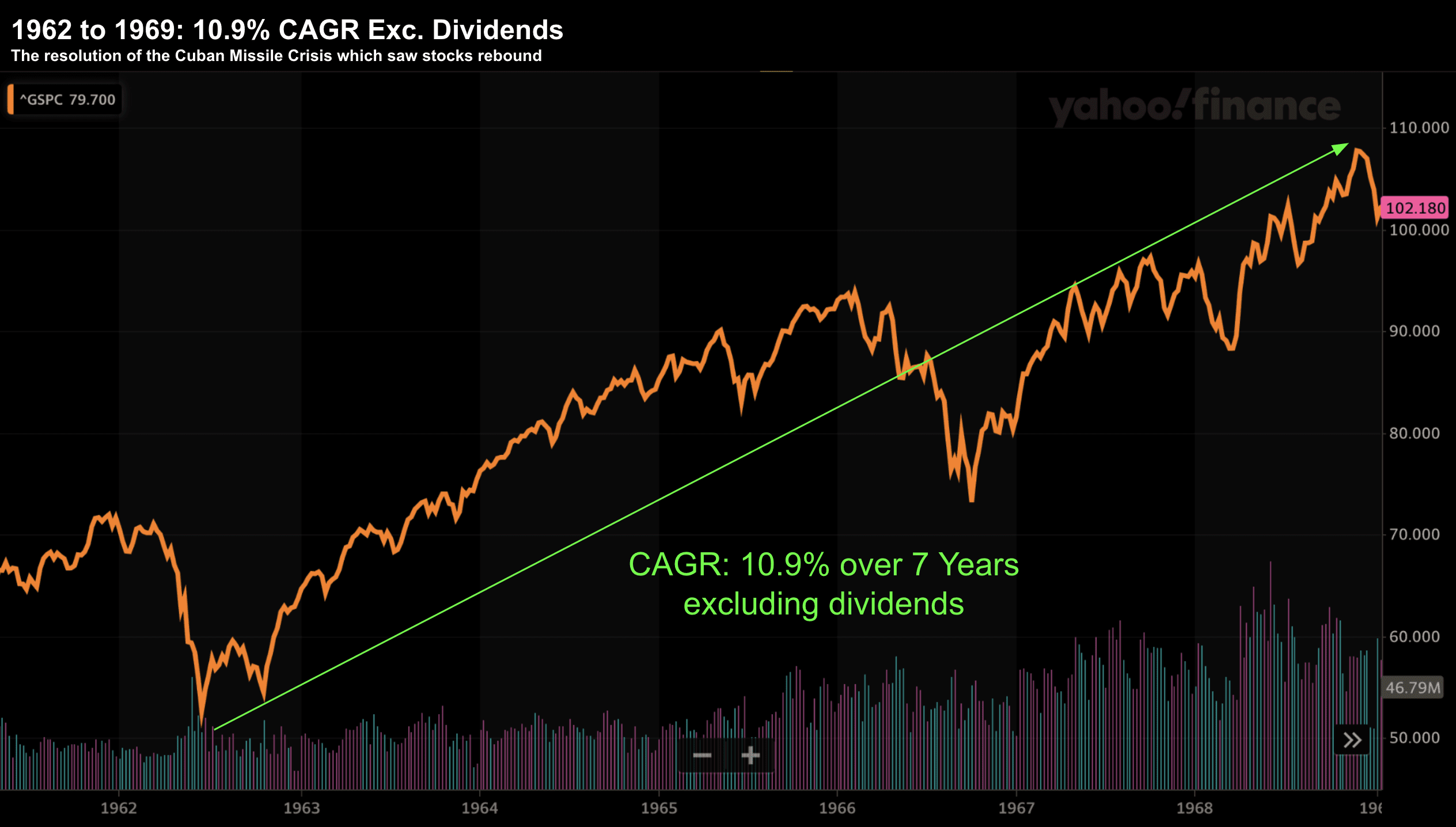 However, over the course of the next 7 years – the market returned ~10.9% CAGR (exclusive of dividends) – if buying near the 1962 June lows.