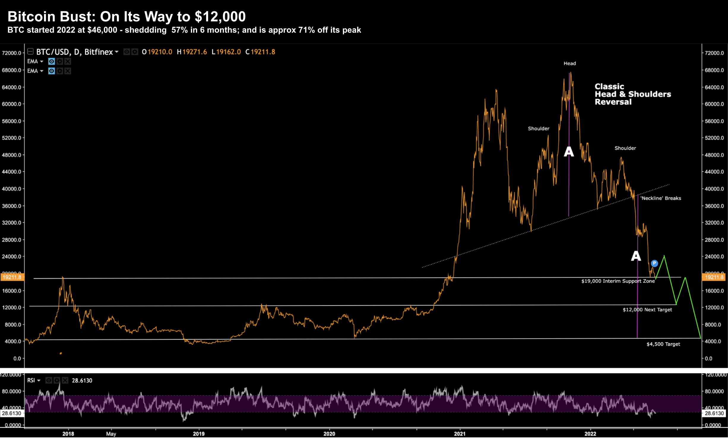 From mine, technically I think $12K is the next stop for BTC (after expected interim support ~$19K) – as it works to complete what is a near-perfect "head and shoulders" reversal:
