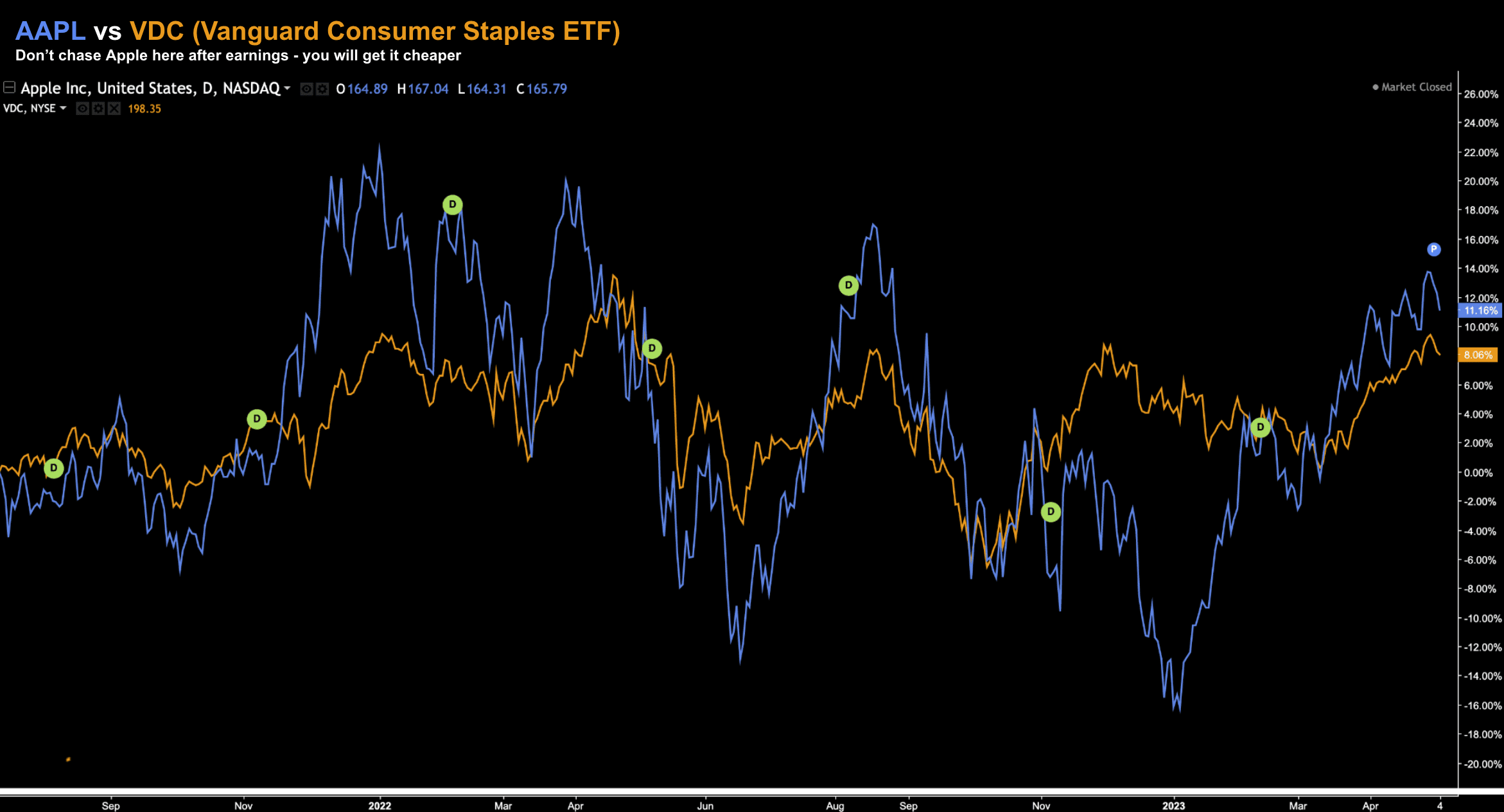 Now, to make my point, consider this chart where I compare the Vanguard Consumer Staples ETF (orange) to Apple (blue)