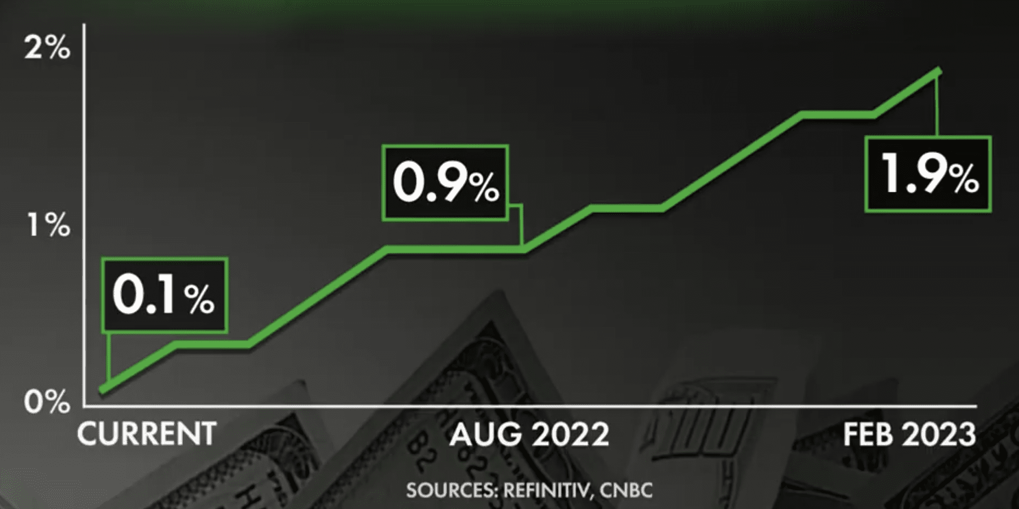 If true, this would imply a hike of 25 basis points at every meeting through the end of 2022.
