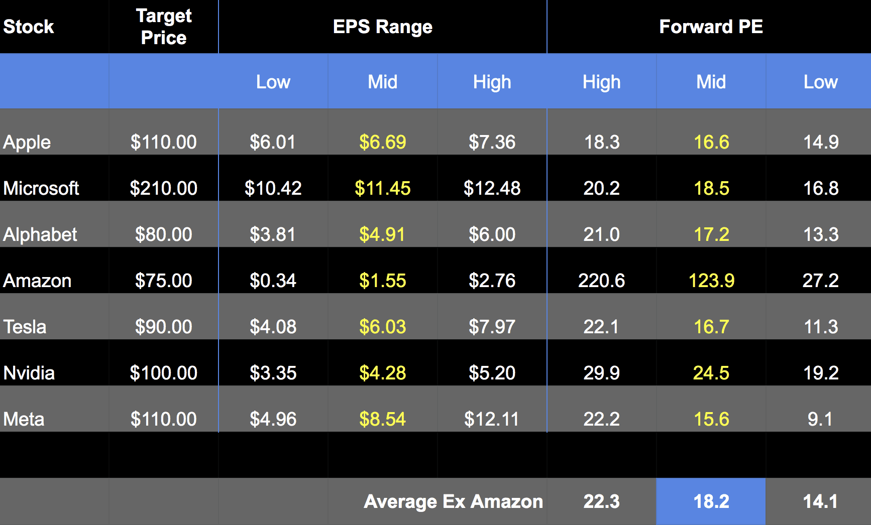 For illustrative purposes only – if we were to take the mid-range of the expected EPS for big-cap tech – you can then play around with"target prices" and possible forward PEs