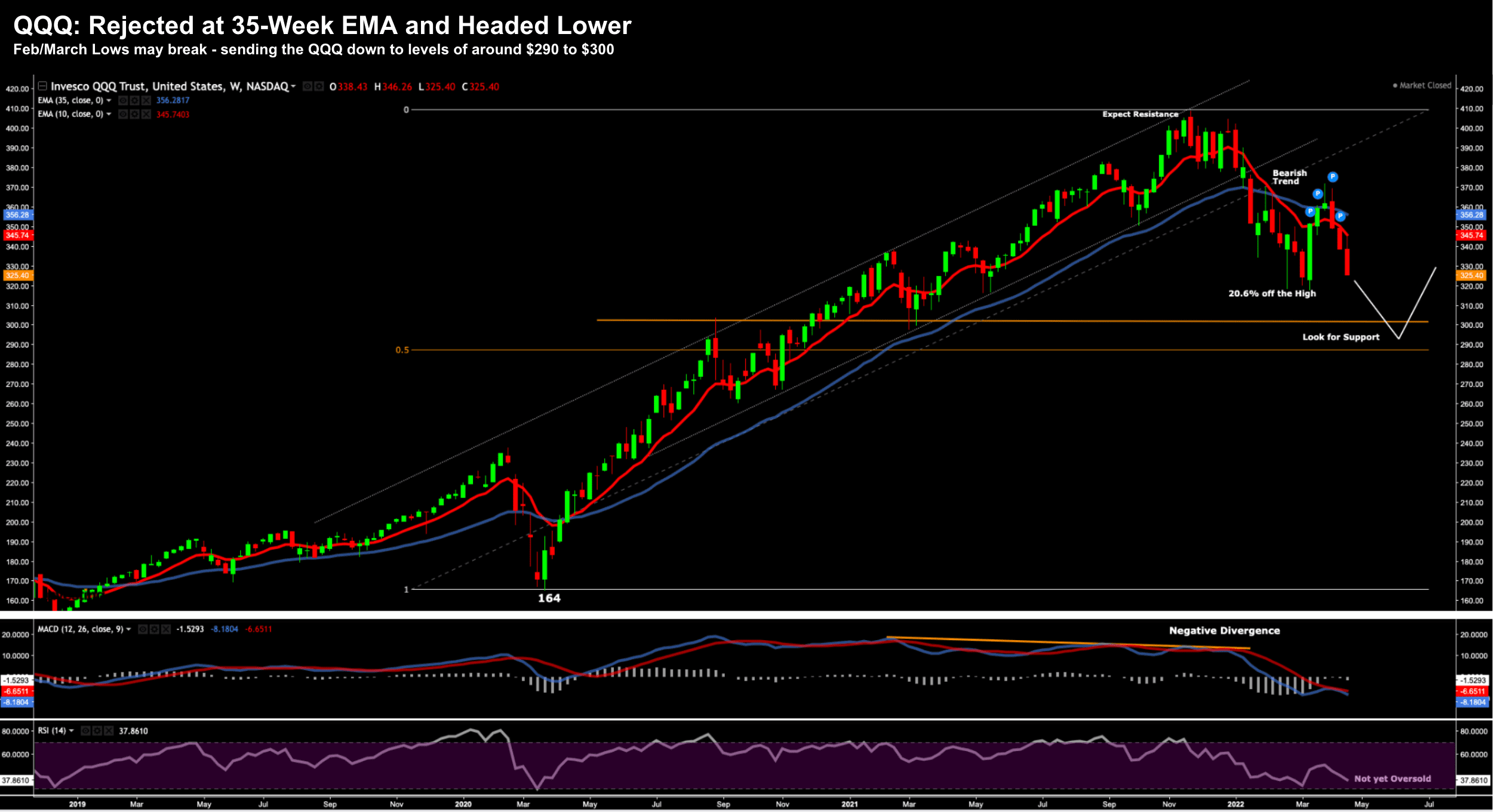 The QQQ was rejected at the 35-week EMA whilst in a weekly bearish trend – and now looks set to test the next level of support ~$300.