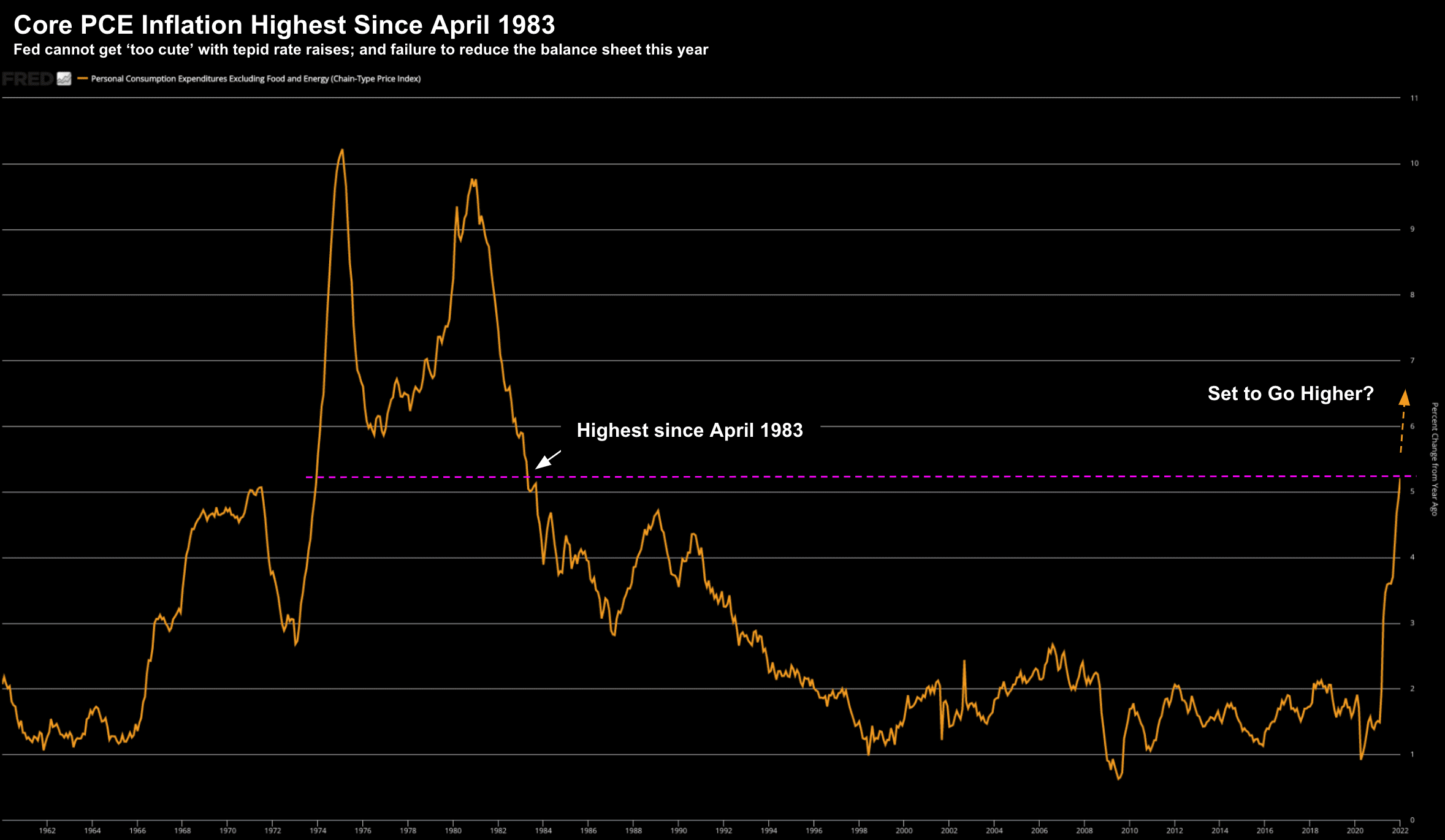 - The core personal consumption expenditures price index, the Federal Reserve"s primary inflation gauge, rose 5.2% from a year ago, slightly more than the 5.1% Dow Jones estimate. It was the highest level since April 1983. Including food and energy prices, headline PCE was up 6.1%, the strongest gain since February 1982.