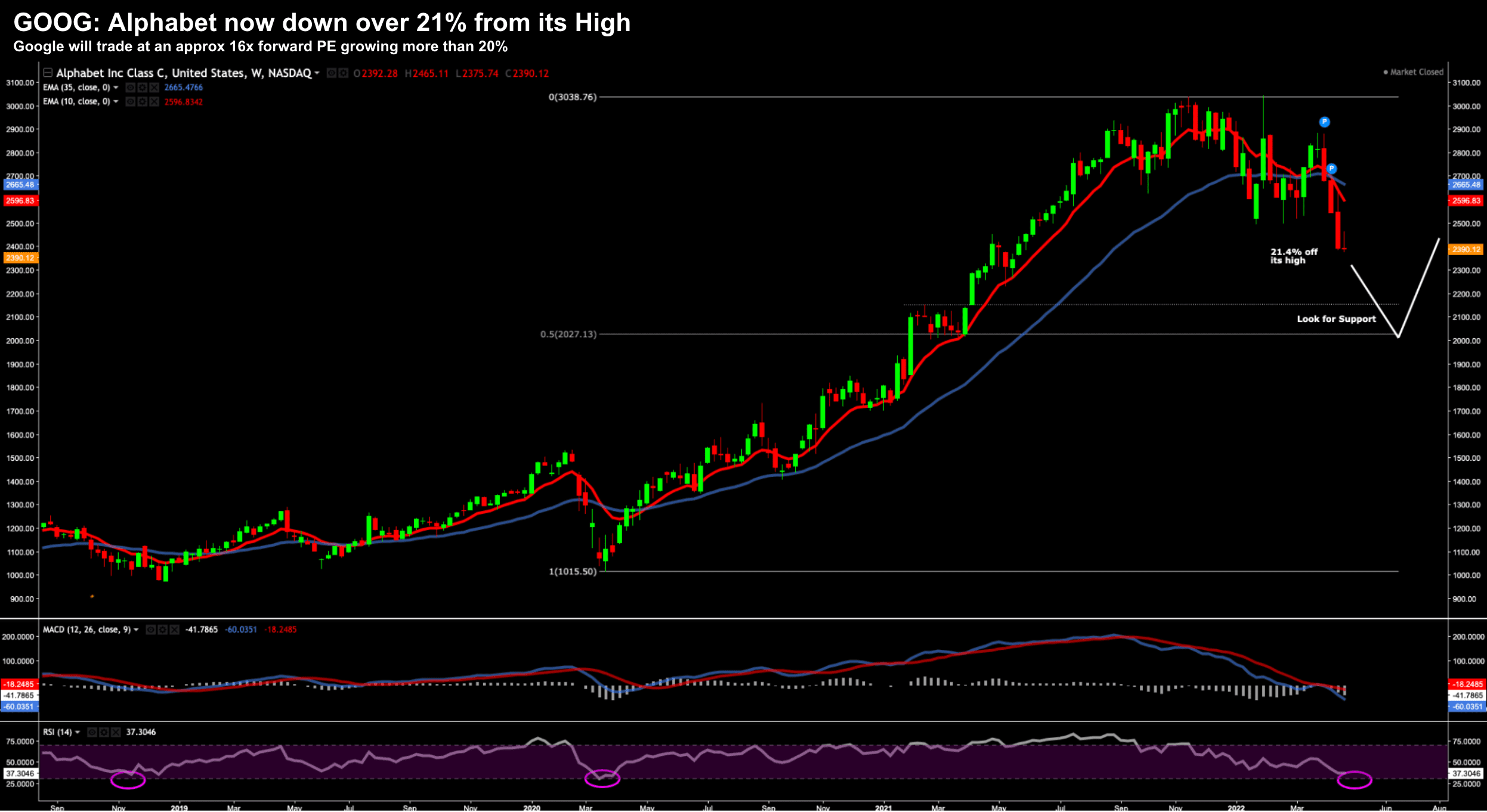 As I say, a forward PE of only ~16x growing at 20%+ (at Google"s margins) – with a $70B buyback in plan – is likely to lure long-term investors before long at current levels.