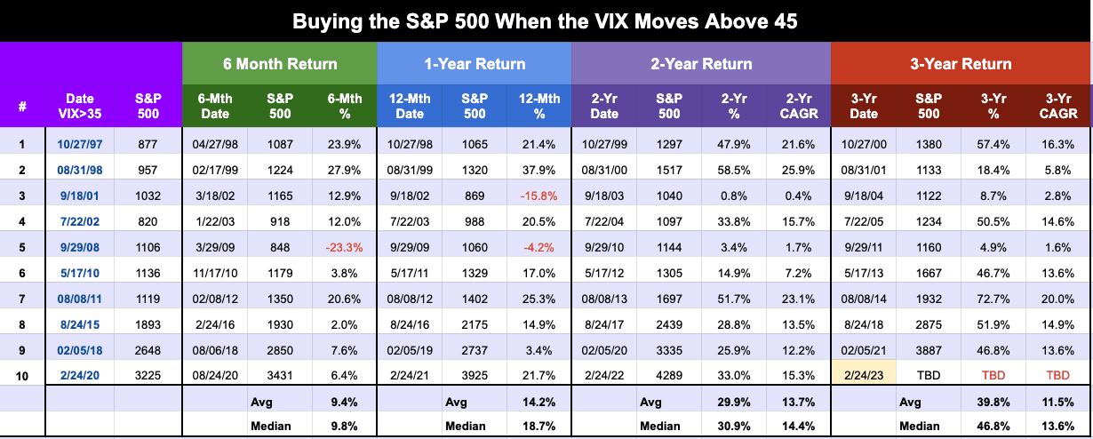 In my experience, buying the market at peak fear often pays dividends over the long term. For example, below are average 6-month, 1-year, 2-year and 3-year returns when buying the VIX at a level of 45 or higher.