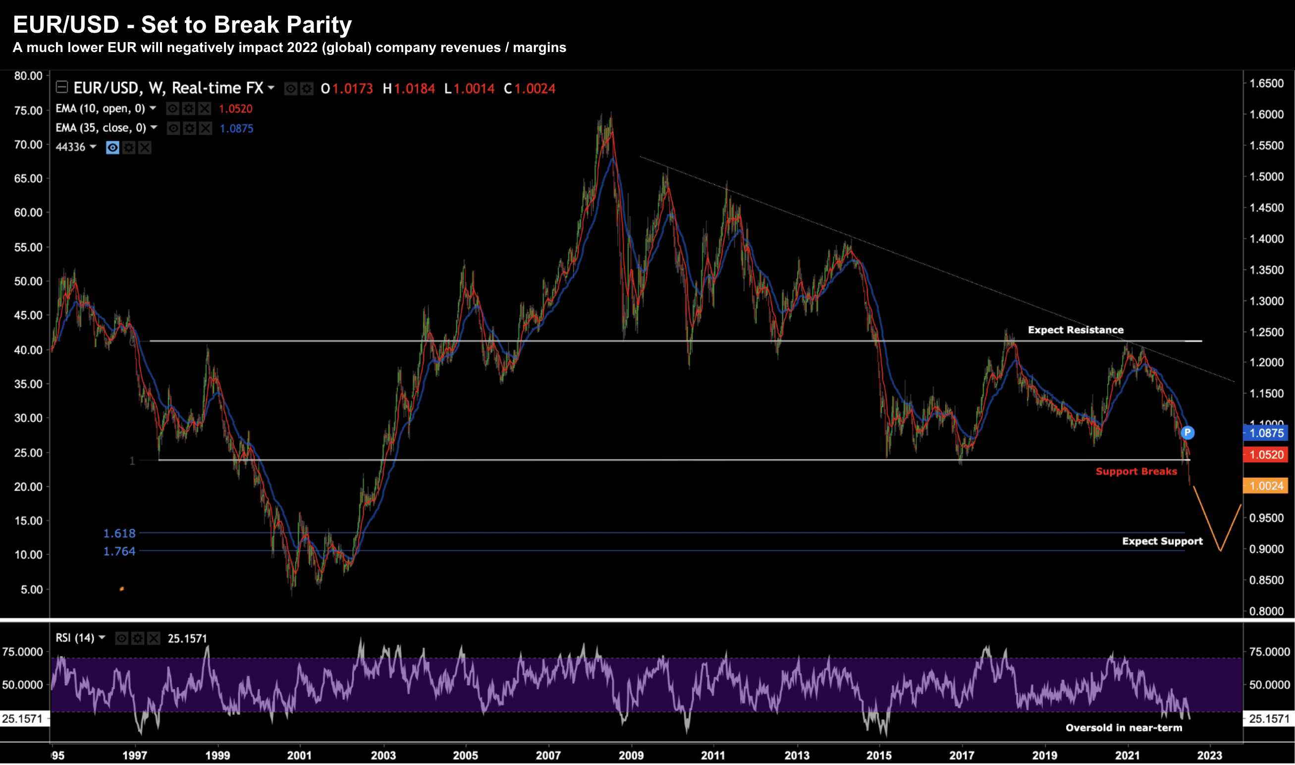 The other week I said the EUR is approaching parity with the USD – and is likely to fall below.