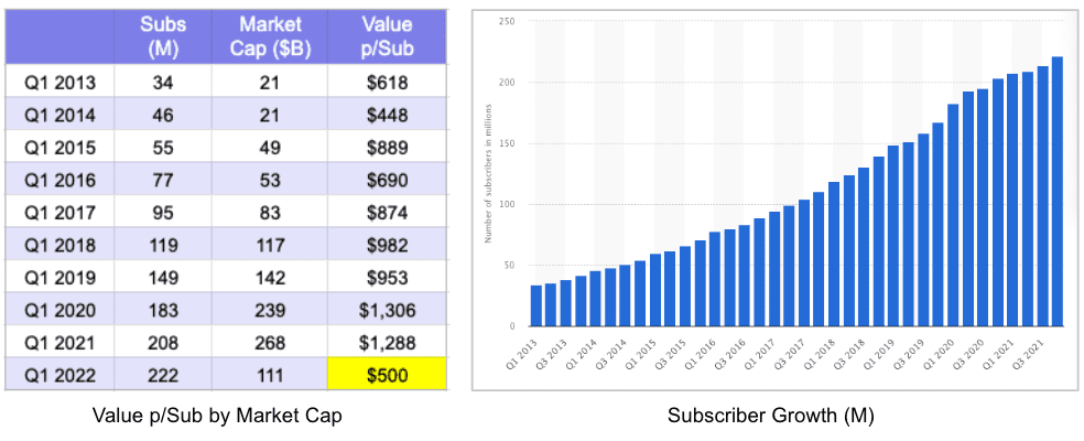 However, a year later Netflix market cap jumped to $49B however subs were only 55M – meaning the value per subscriber jumped to $889.