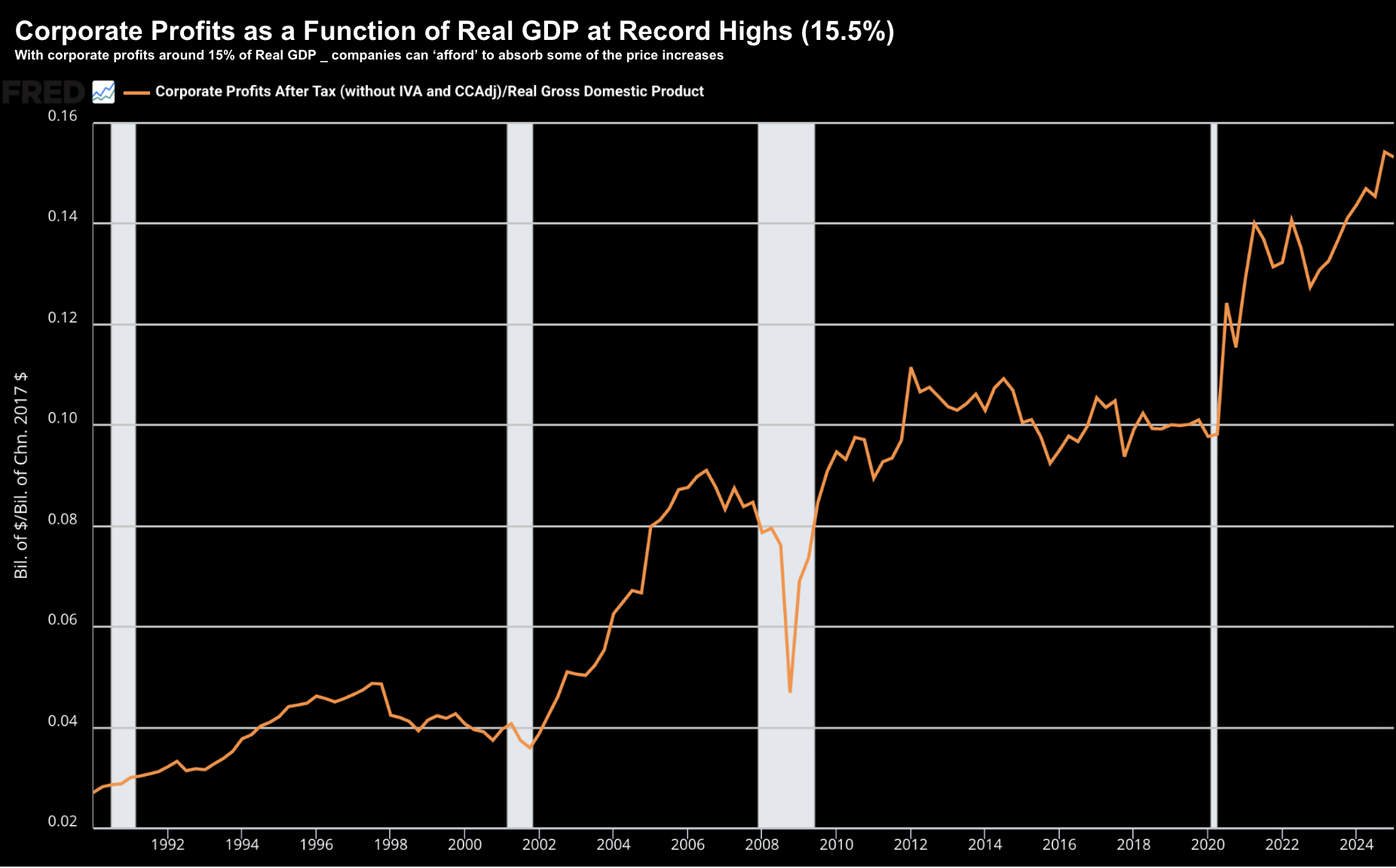 Now if we also consider the fresh corporate tax cuts in the Big Beautiful (Inflation) Bill coming down the legislative pike – it makes sense why corporations are soaking up some of the pain (for now).