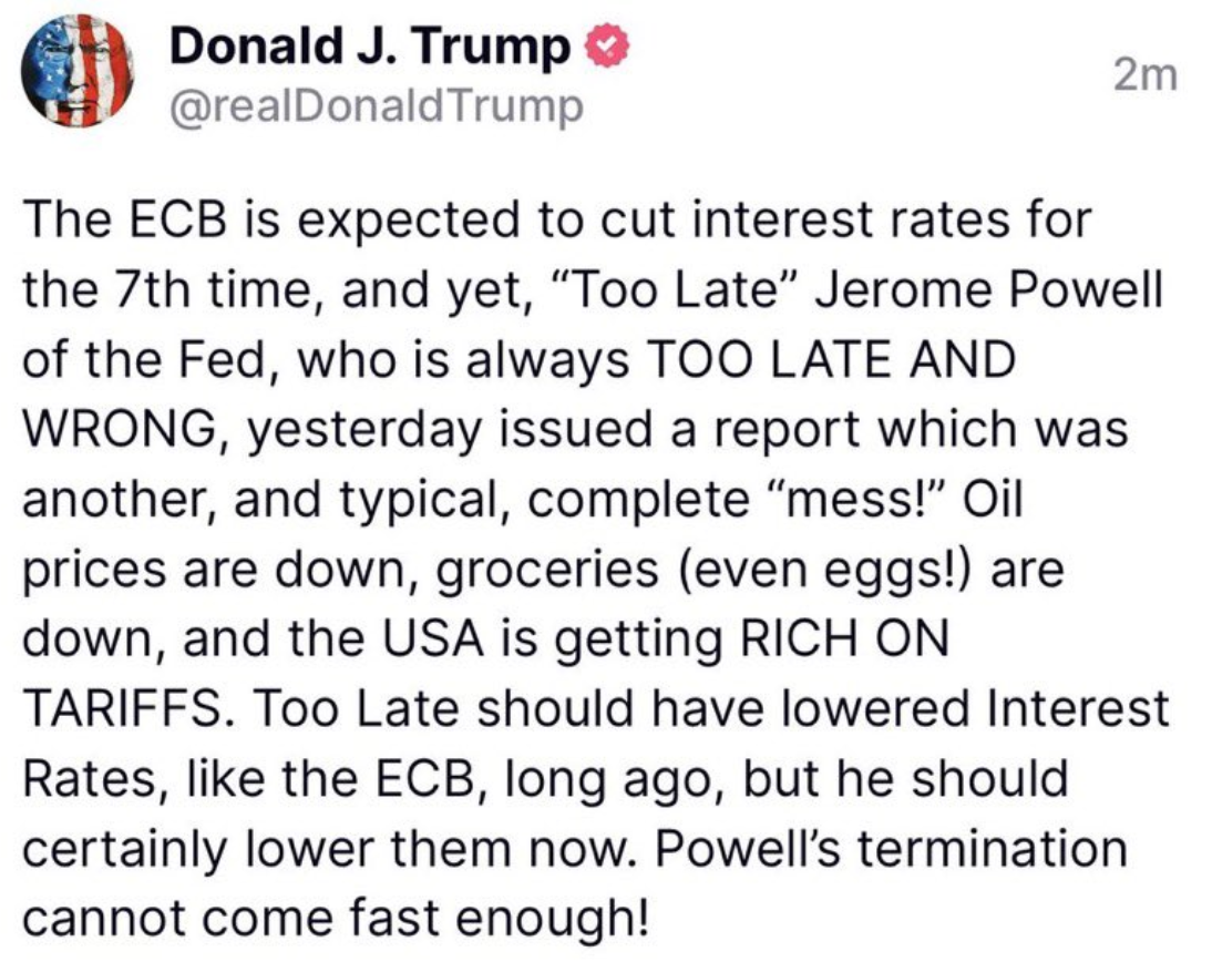 Not only does the market want rate cuts – the President has been demanding it with enraged tweets like this: