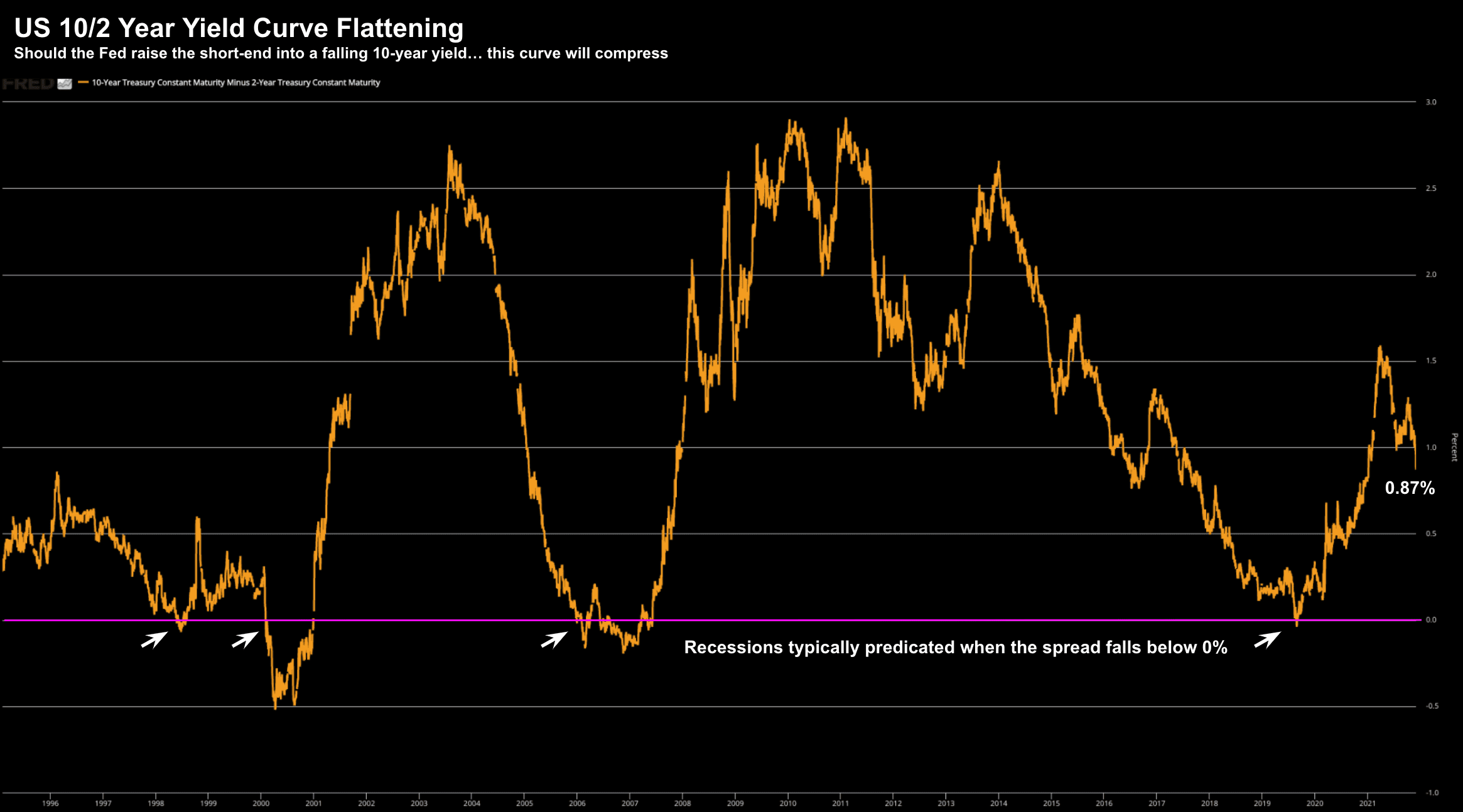What the market fears is this could compress further if the Fed are to raise short-term rates to fight inflation; and the 10-year fails to rally in unison.