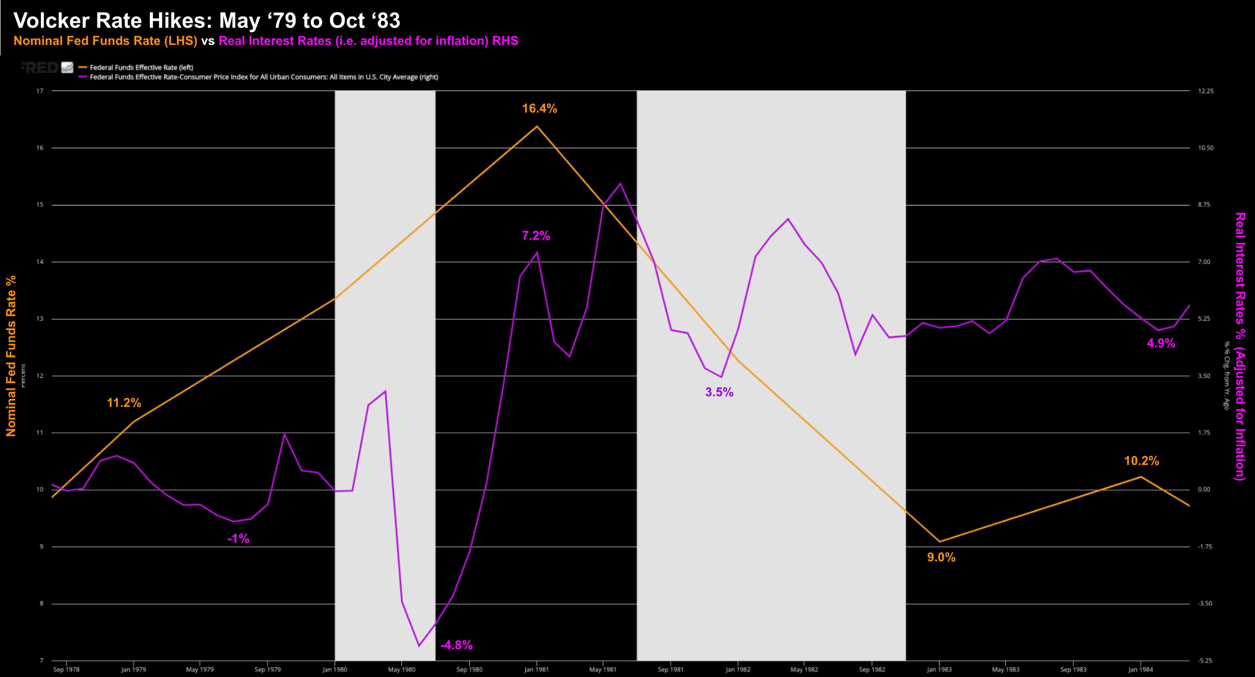 Now the chart below shows both nominal (orange) vs real interest rates (purple – adjusted for inflation) from May 1979 through October 1983