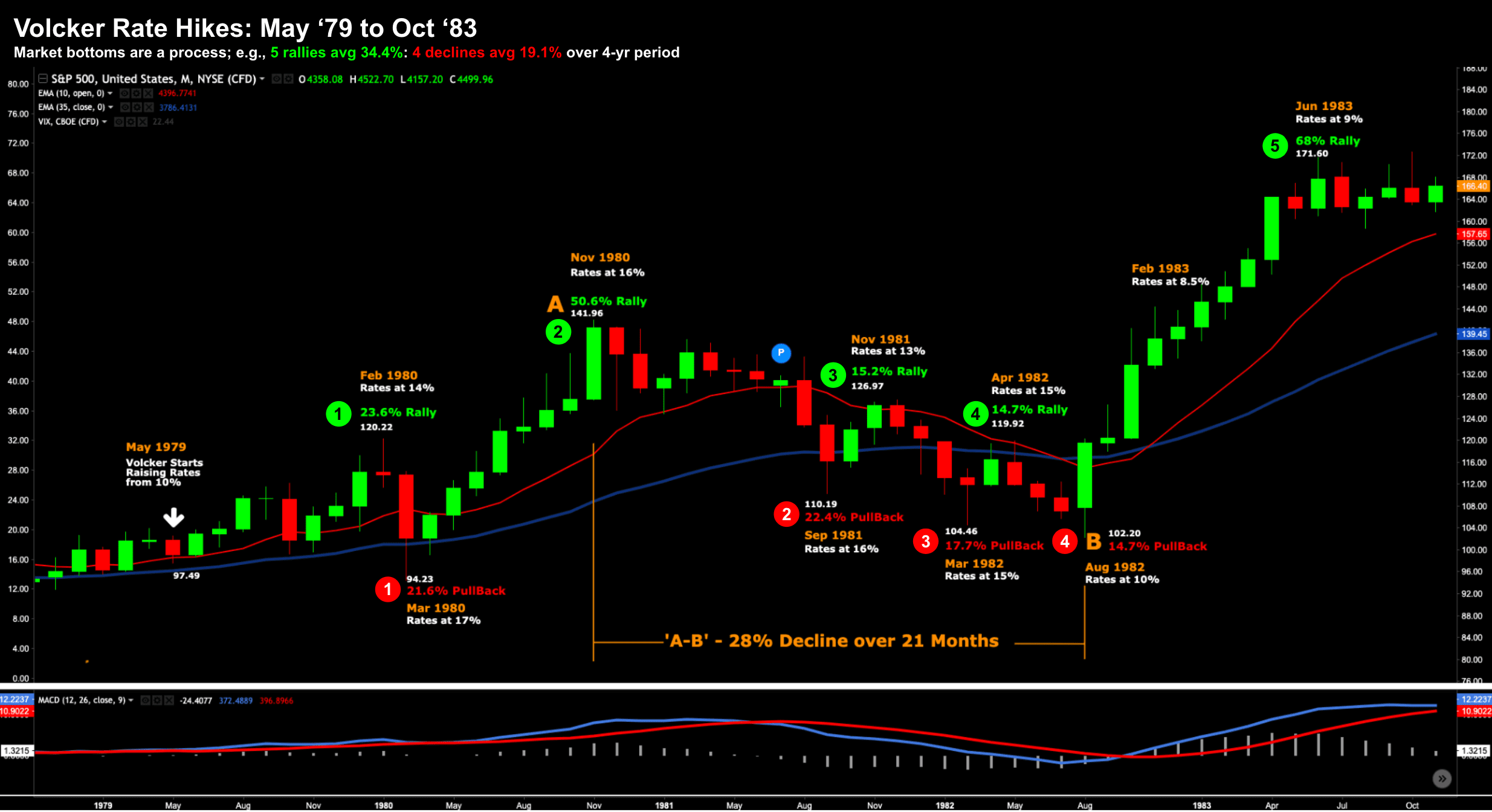 Volcker then eased rates from 17% to 16% from Mar 1980 to Nov 1980 – and the market rallied some 50.6% (rally #2)