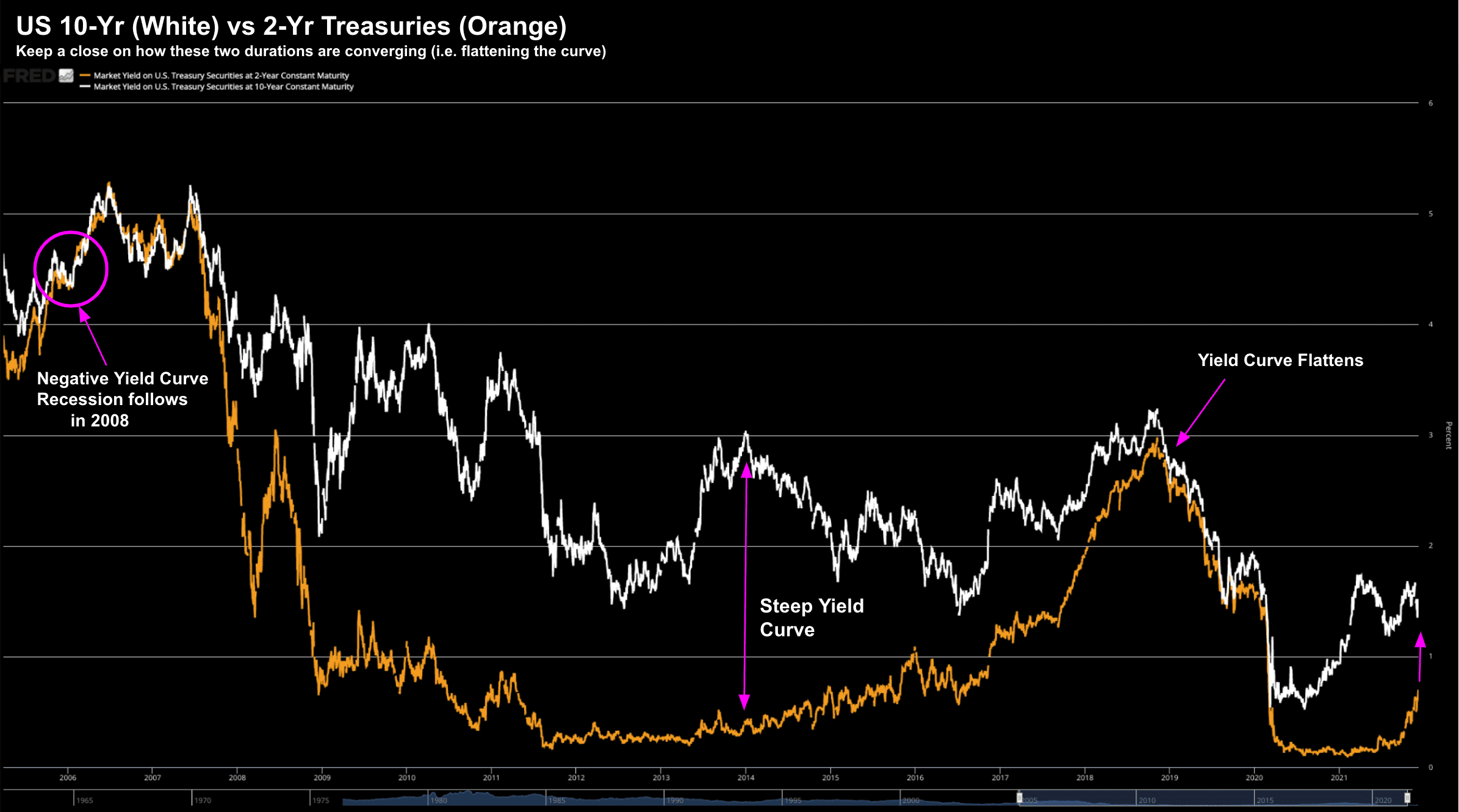 For example, below is the 10-year Treasury Yield (white) vs the 2-Year Treasury Yield (orange)