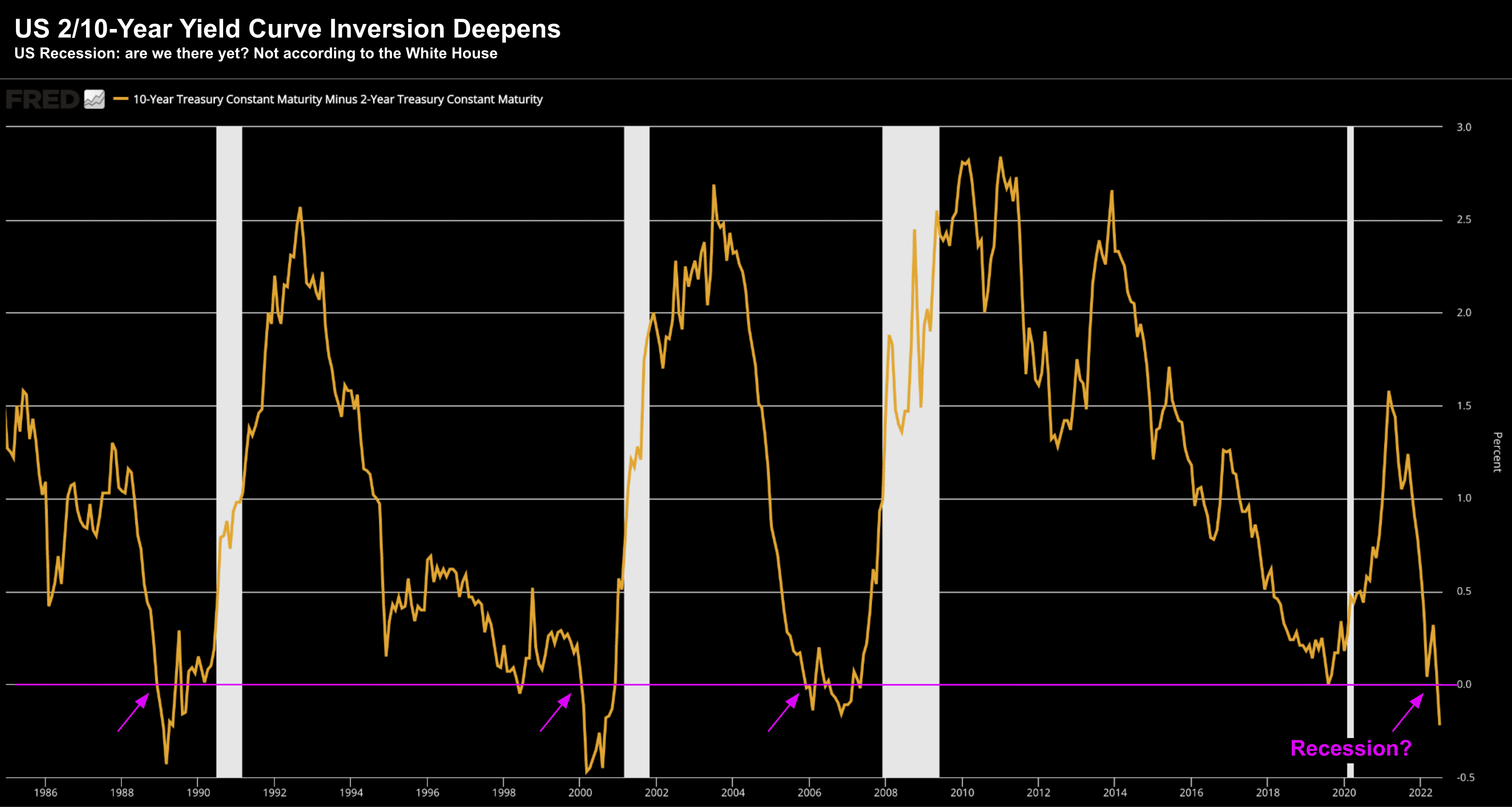 That said, take a look at the impact of the 2/10 yield curve – as it continues to trade well below zero