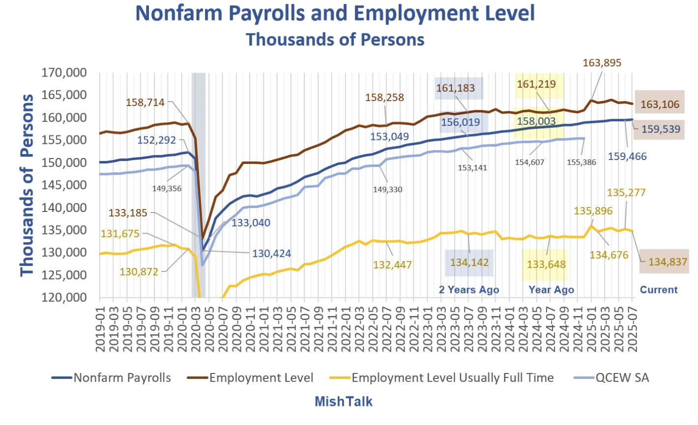 - In July data, full-time employment fell by 440,000, while part-time work increased by 247,000 — a sign of labor market fragility, underemployment, and possible economic stress