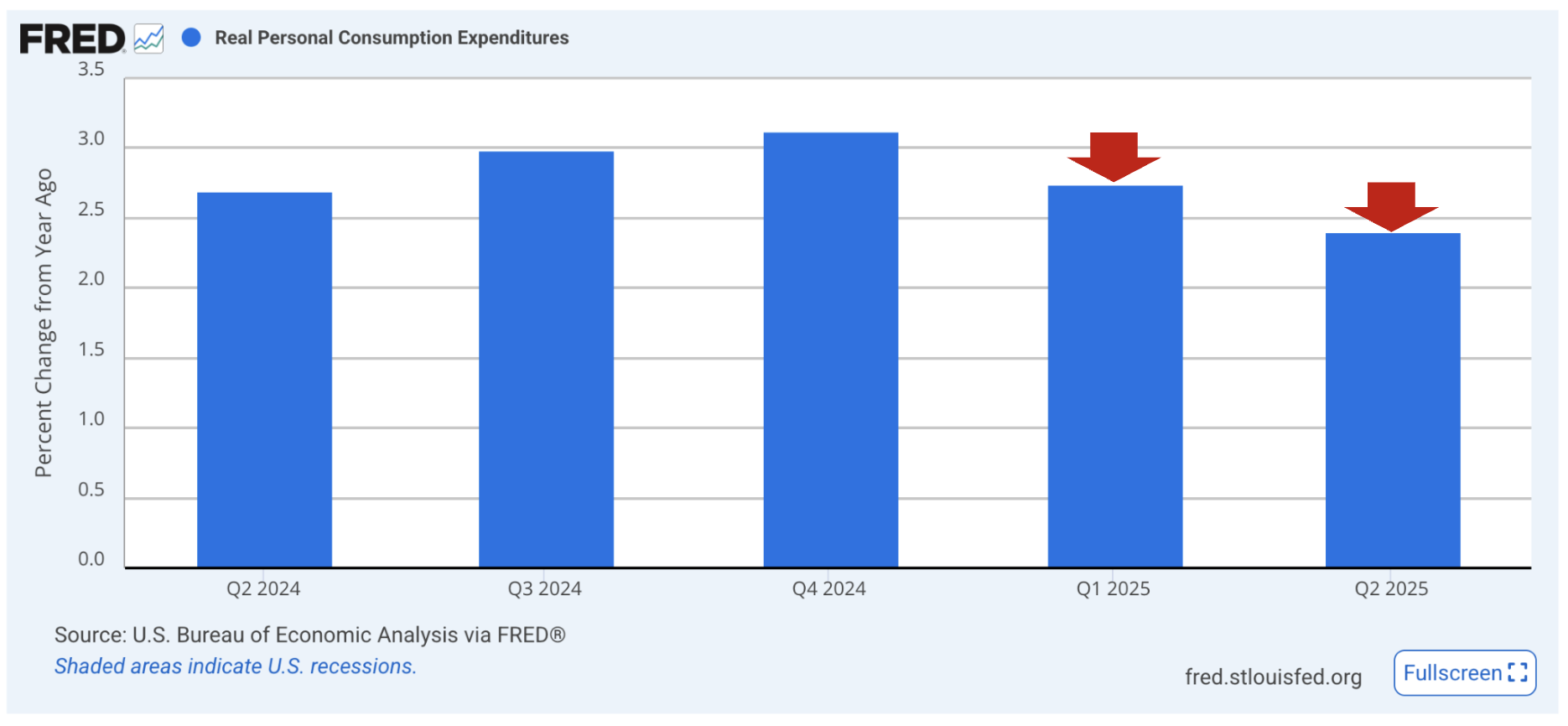 As part of this post – I reiterated my preferred (forward looking) economic indicator to monitor consumer spending health is the change in real PCE (Personal Consumption Expenditures) on a quarterly basis year-over-year (e.g. the change YoY for Q2 2025 vs Q2 2024)