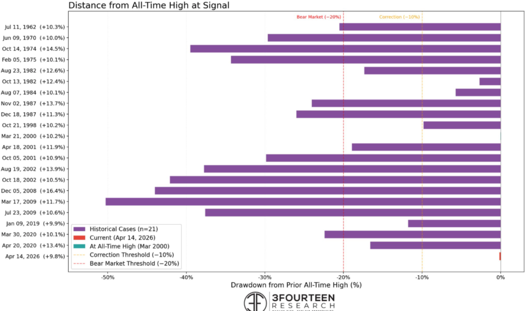 A 10% rally from oversold, undervalued conditions (1982, 2009, 2020) is structurally different from a 10% rally near highs with elevated valuations (2000).