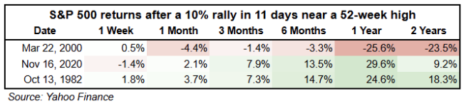 Most prior instances of these rapid 10%+ rallies did not begin with the S&P 500 near a 52-week high.