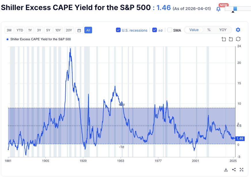 Now, if bond yields rise toward 4.75–5.0%—a plausible outcome given persistent inflation pressures and elevated oil prices—the excess CAPE yield would likely turn negative again.