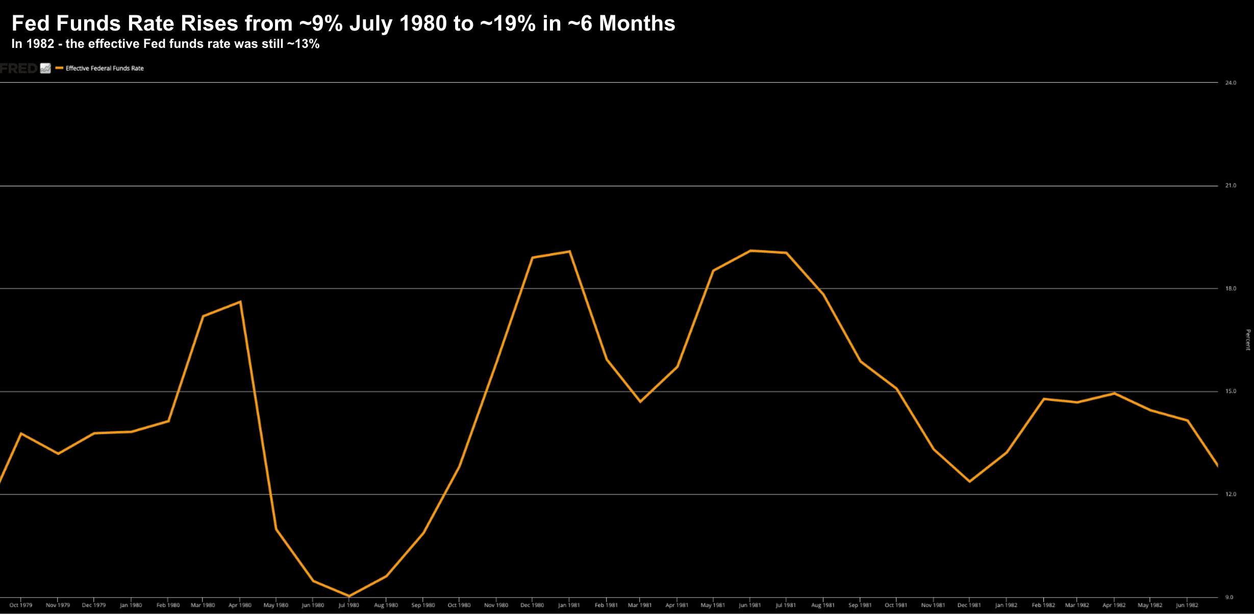 For example, he raised rates from ~9% in July 1980 through to around 19% in just 6 months.