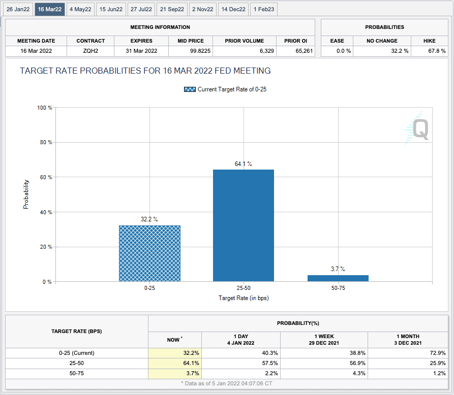 Current fed fund futures market pricing is indicating about a 2-to-1 chance of the first hike coming in March, according to the CME"s FedWatch Tool. Traders figure the next increase would come in June or July, followed by a third move in November or December.