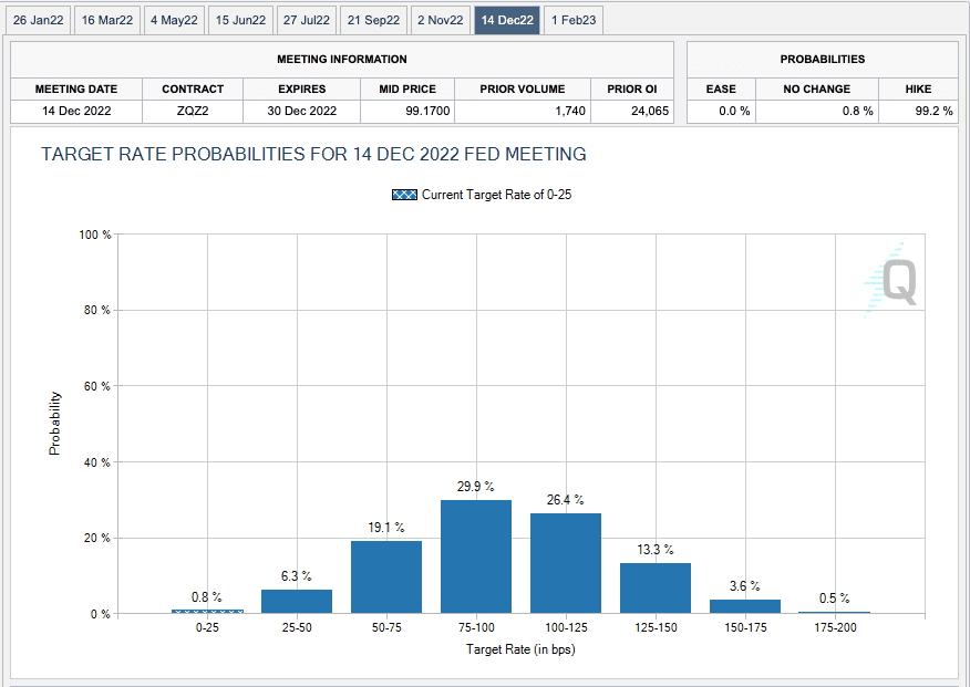 Looking further to December – the CME"s FedWatch Tool suggests a ~30% probability b/w 75-100 bps and 26% of 100-125 basis points.