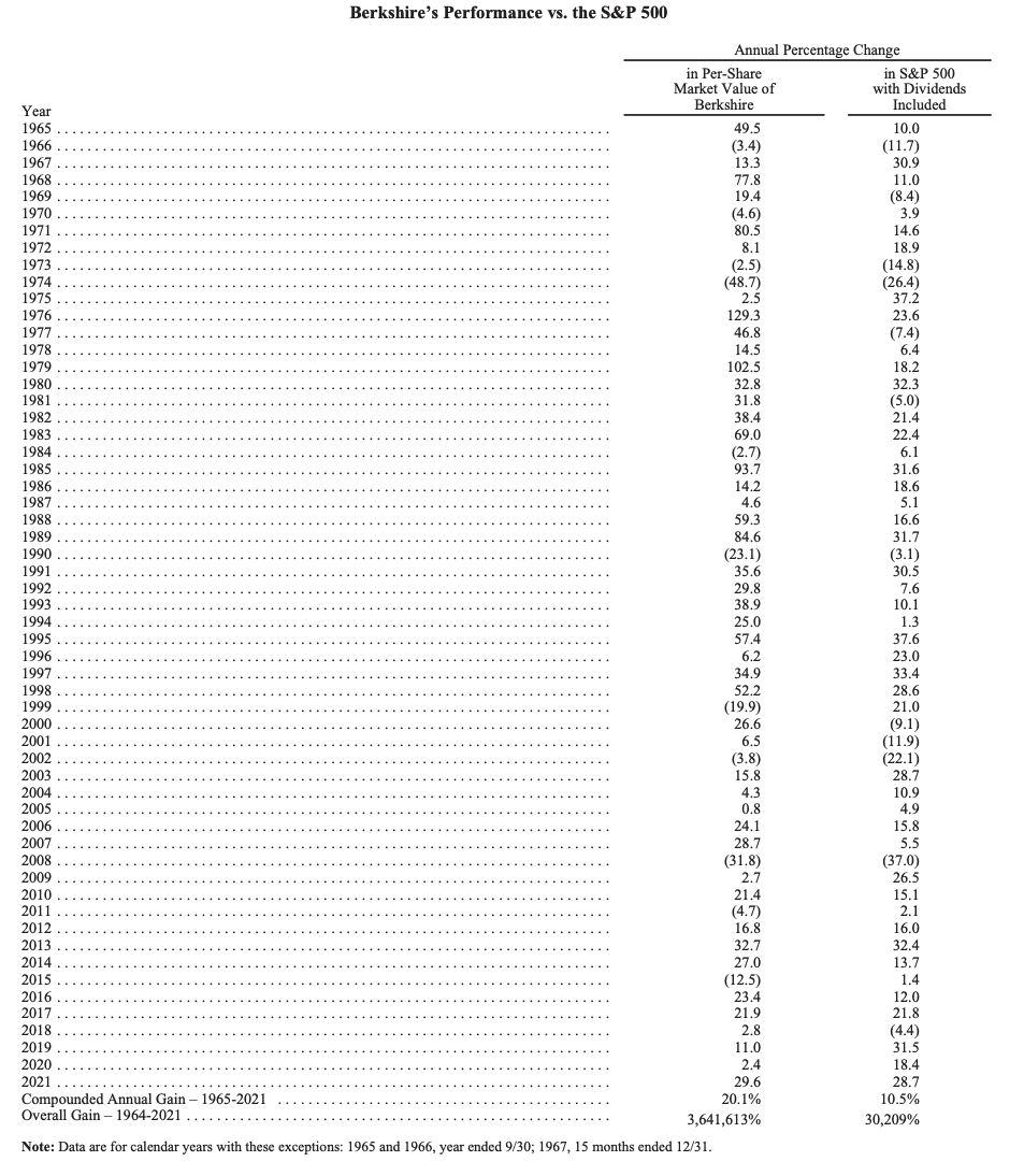 For example, recently I provided this table when reviewing Berkshire Hathaway"s annual returns vs the S&P 500 from 1957: