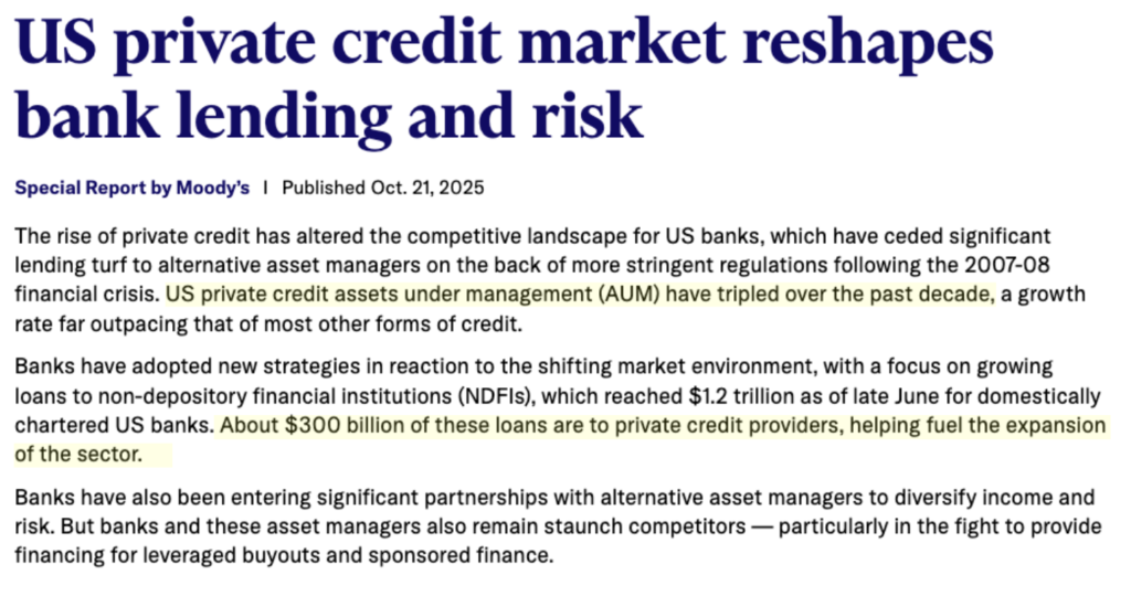 According to Moody"s – regulated banks have lent roughly $300 billion directly to private credit funds.