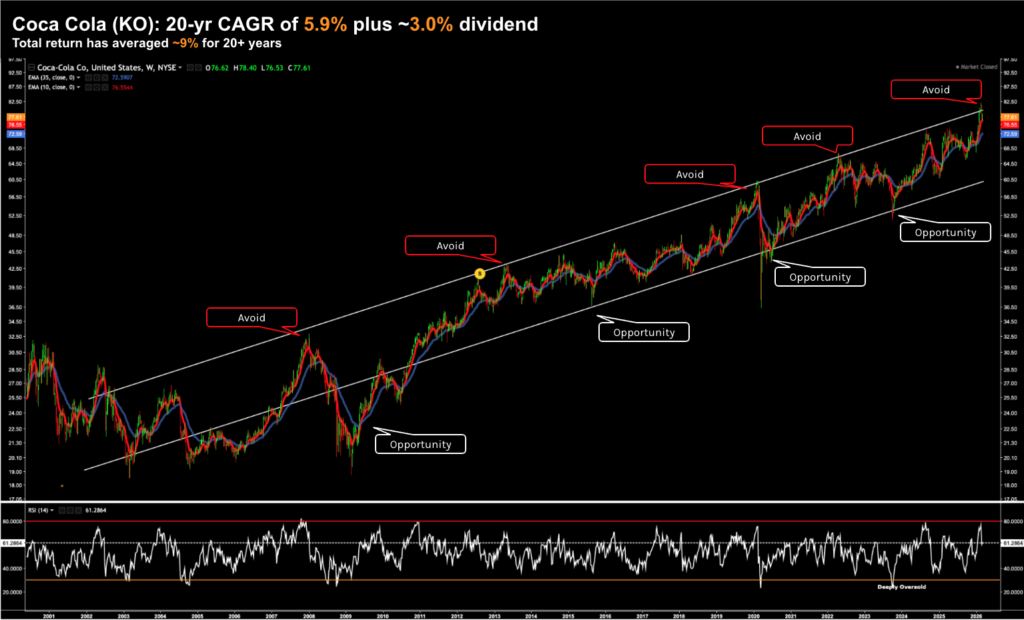 Below is the 20-year chart for KO – which has returned investors a total CAGR of ~9% (inclusive of an average 3% dividend)