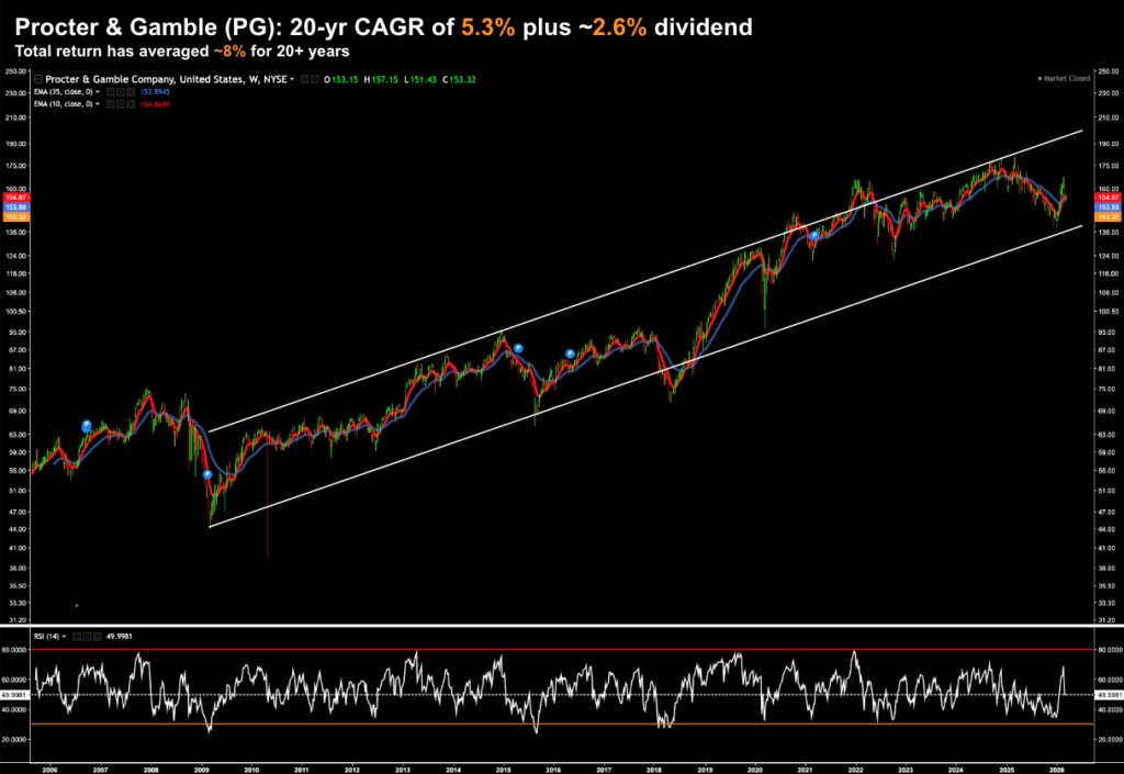 For example, if you overpaid for PG in early 2022 (above the trend channel) – your returns are basically flat over the past four years.