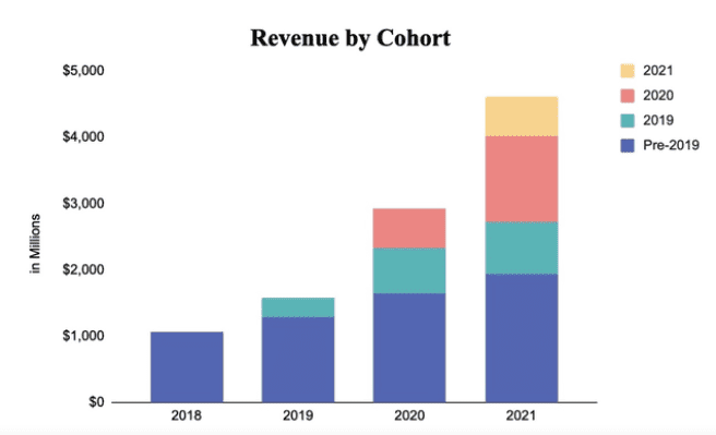 Here we see how existing merchant revenue earned from pre-2019 has almost doubled between 2018 and 2021.