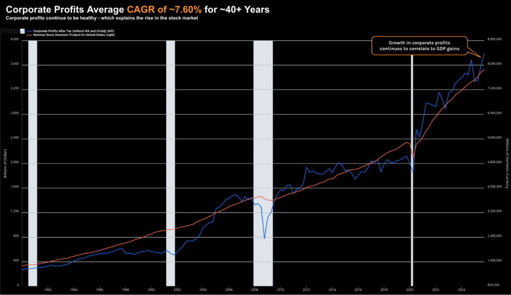 Corporate profits have averaged a CAGR of ~7.6% over several decades – tracking the growth in nominal GDP.
