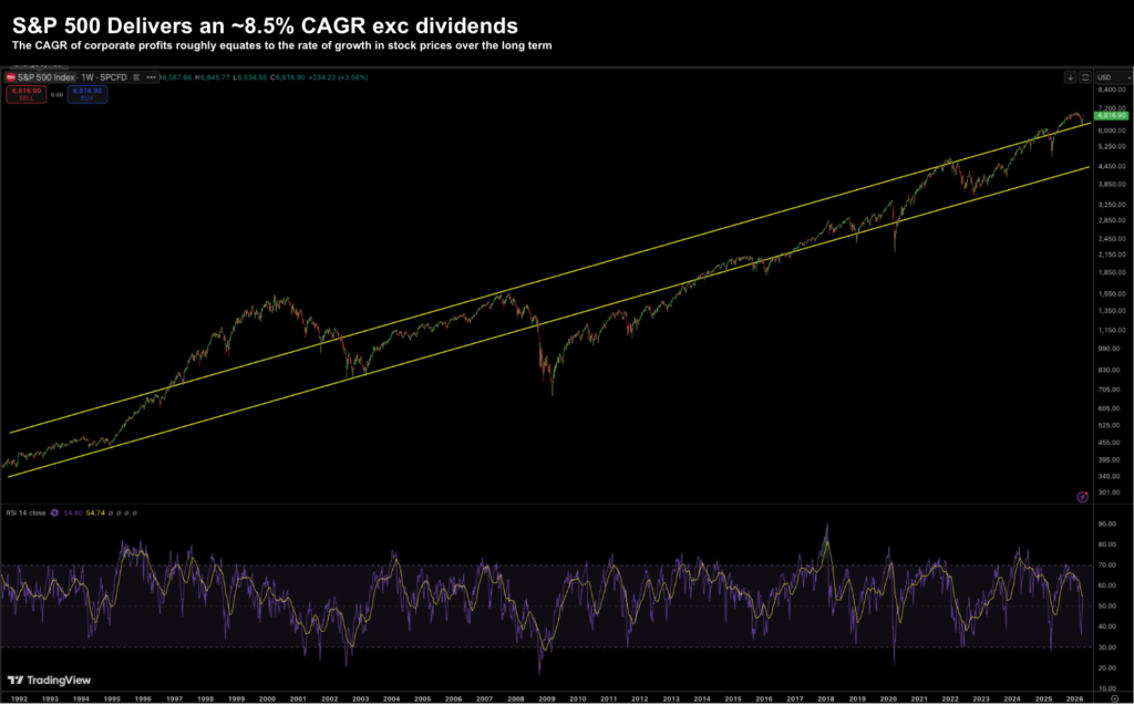 Above is a 30-year chart for the S&P 500. It shows the Index averaging an 8.5% CAGR exclusive of 1% to 2% dividends (e.g., a total return averaging in the realm of ~10.5%).