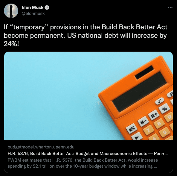 Here"s a tweet from Elon Musk – who expressed his disapproval of the bill – despite a govt $12K subsidy for any new electric vehicle purchase)