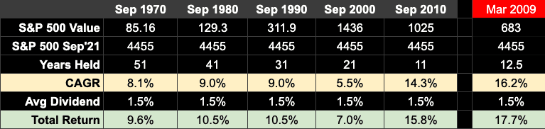 However, if you bought the S&P 500 Sept 2010 (i.e., which was well after the market bottomed) – your CAGR is 14.3% plus dividends.